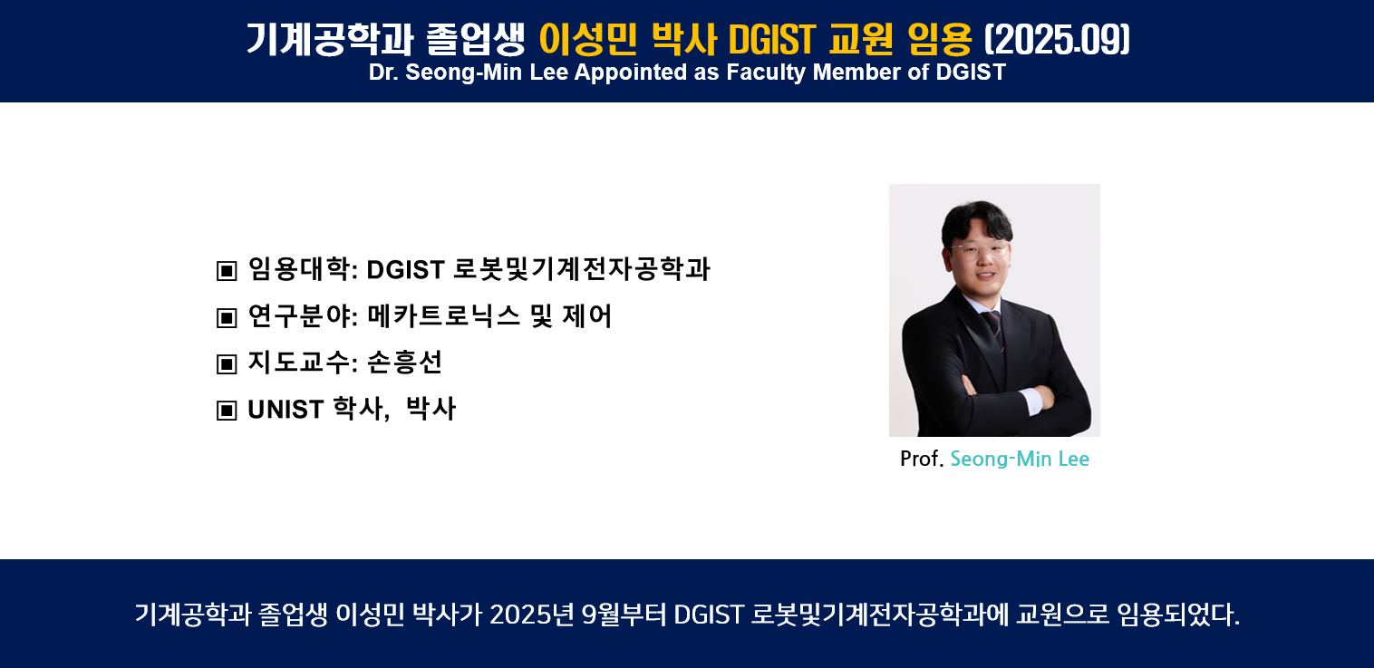 기계공학과 졸업생 이성민 박사 DGIST 교원 임용 (2025.09)
