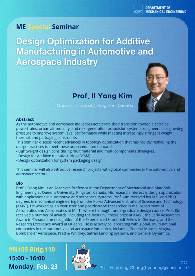 [ME Special Seminar] “Design Optimization for Additive Manufacturing in Automotive and Aerospace Industry”(2/23) 2026.02.23 Date 2026-02-23 15:00:00 Lecturer Prof. Il Yong Kim Venue Bldg.110 #N105 Contact Prof. Hayoung Chung (hychung@unist.ac.kr)